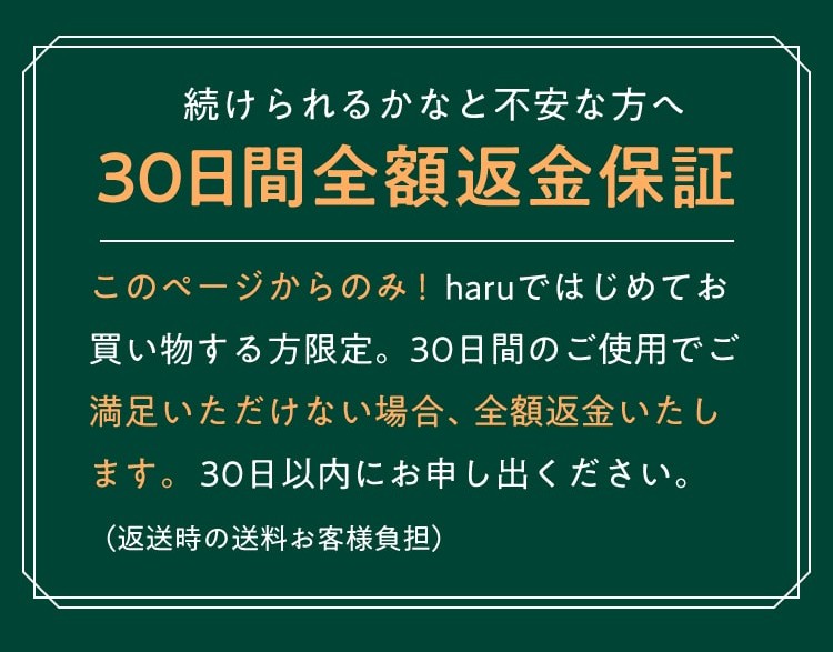 実感を感じやすい6か月を目途に継続してご使用いただく事をオススメしています。ですが、ご満足頂けない場合はお届け後30日以内であれば全額返金いたします。また、回数縛りはありません。2回目以降の解約、お休みも可能です。詳しくは下記の6か月チャレンジ特典でご確認ください。